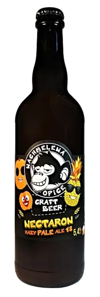 Nectaron Hazy Pale Ale 13° od pivovaru Nachmelená opice stojí na jednoduchém, ale přesně cíleném konceptu single malt a single hop. Použití jednoho druhu sladu nechává maximálně vyniknout charakter chmele, který v tomto případě hraje hlavní roli. Tělo je středně plné, zakalené, s jemnou strukturou typickou pro moderní hazy pale ale, zatímco hořkost zůstává vyvážená a příjemně zakulacená. Klíčovým prvkem je novozélandský chmel Nectaron, který pivu propůjčuje výrazný aromatický profil. Dominují šťavnaté tóny tropického ovoce, zejména broskví, ananasu a lehce citrusového nádechu, který přidává svěžest a pitelnost. V chuti se propojuje ovocná plnost s jemnou sladovou linkou a čistým dozníváním, které podtrhuje moderní pojetí craft piva zaměřeného na aromatiku a chmelový charakter.
