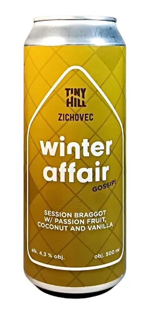 Winter Affair Gossip 11° je moderní Session Braggot vzniklý ze spolupráce českého pivovaru Zichovec a dánského Tiny Hill, kteří jsou známí svým inovativním přístupem k medovinám. Braggot je historický styl stojící na pomezí piva a medoviny a v tomto případě dostává svěží, současnou podobu. Základ tvoří kvalitní med, který dodává jemnou sladkost, květinové tóny a hladké, zaoblené tělo. Nižší obsah alkoholu zachovává lehkost a vysokou pitelnost, zatímco perlivý charakter a vyvážený říz drží celý profil svěží a živý. Chuťový profil doplňuje výrazná kombinace tropických ingrediencí. Mučenka přináší šťavnatou kyselkavost a ovocnou svěžest, kokos dodává krémovou tropickou hebkost a vanilka vše propojuje do dezertně laděného, ale stále osvěžujícího celku. Použitý chmel Sládek přispívá jemnou bylinnou linkou a lehkým kořenitým aroma, které podtrhuje komplexnost nápoje bez výrazné hořkosti. Výsledkem je netradiční řemeslné pivo s charakterem moderního braggotu, kde se med, tropické ovoce a český chmel spojují do harmonického a originálního chuťového profilu.