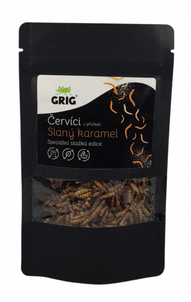 Červíci se slaným karamelem - Sušení mouční červi s příchutí slaný karamel - výrobce GRIG