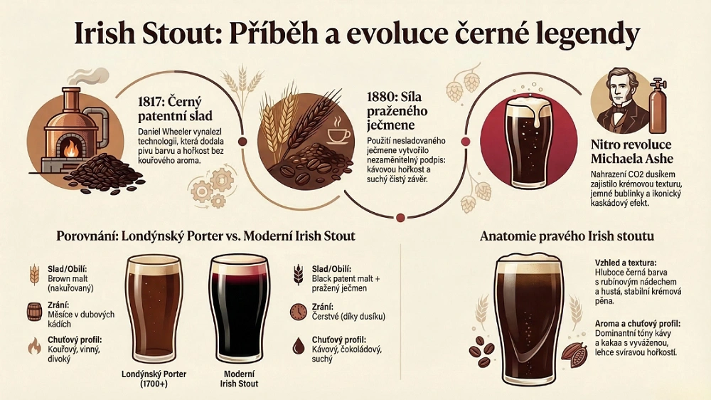 Irish stout. Jedno z nejoblíbenějších černých piv na světě. Krémová pěna, vůně kávy a čokolády, suchý závěr, který vás volá k dalšímu doušku. Jenže tohle pivo má za sebou příběh, který většina lidí nezná – a je to příběh plný nečekaných zvratů, technologických revolucí a odvážných rozhodnutí irských sládků.