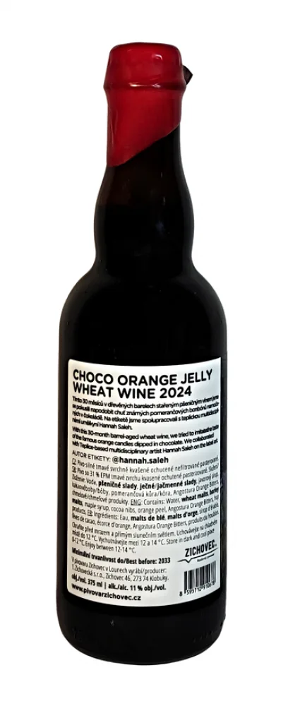 Choco Orange Jelly Wheat Wine 2024 31° od Pivovaru Zichovec je skutečným klenotem mezi Barrel Aged Barley Wine pivy. Tento unikátní blend tří pšeničných piv, inspirovaný legendárními vánočními čokoládovými bonbony, se pyšní bohatým chuťovým profilem. Po 30 měsících zrání v dřevěných sudech získalo pivo hloubku, kterou dále obohacují tóny pomerančů, pomerančové kůry, kakaových bobů a jemná sladkost javorového sirupu. Výsledkem je překvapivě pitelný, harmonický zážitek s dotekem nostalgie. Design etikety navrhla teplická umělkyně Hannah Saleh, která pivu propůjčila vizuální jedinečnost odpovídající jeho chuťovému charakteru.