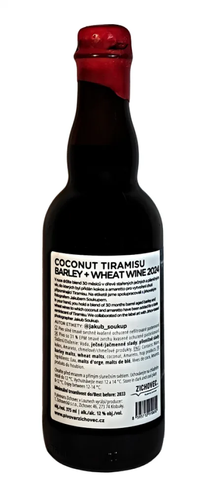 Zažijte unikátní chuťový zážitek s Coconut Tiramisu Barley + Wheat Wine od Pivovaru Zichovec. Tento jedinečný blend spojuje sílu ječného a jemnost pšeničného piva, které zrálo celých 30 měsíců v dřevěných sudech po Bourbonu. Výsledný mix je obohacený o kokos a amaretto, díky čemuž dokonale vystihuje sladké nuance italského tiramisu. Barrel Aged Barley and Wheat Wine ve své nejlepší podobě – robustní, komplexní a nezapomenutelně lahodné. Ideální volba pro milovníky silných a originálních piv.